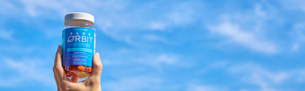 A hand holding up a bottle of AdvoCare Blue Orbit in a bright blue sky.